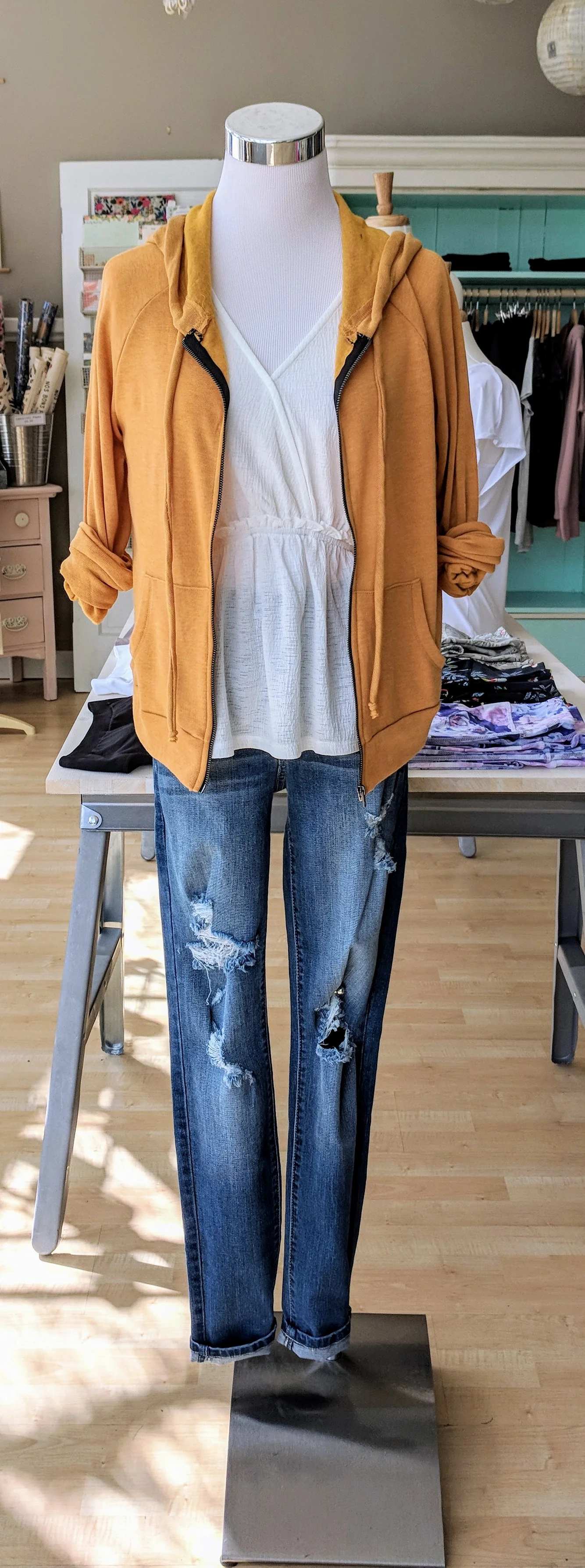 Short Sleeve White Dolman Ruffle top, Cropped Zip-Up Hoodie in Gold